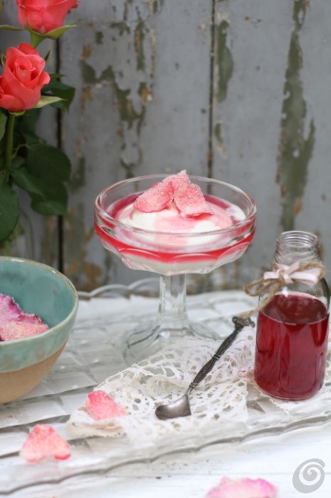 Zraven lahko postrežete še s kandiranimi cvetovi vrtnic, kako se jih pripravi, pa lahko preberite tukaj. Avantgardna sladica za vse, ki se v življenju ne ogibate sladkosti in užitkov.