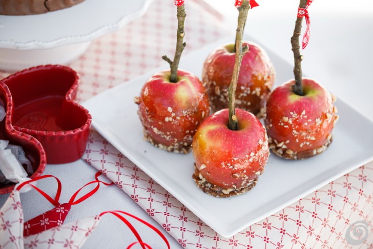 Jabolka oblijemo s karamelno maso, preden se strdi, in jih posujemo s sesekljanimi lešniki. Na sredino zapičimo palčko.