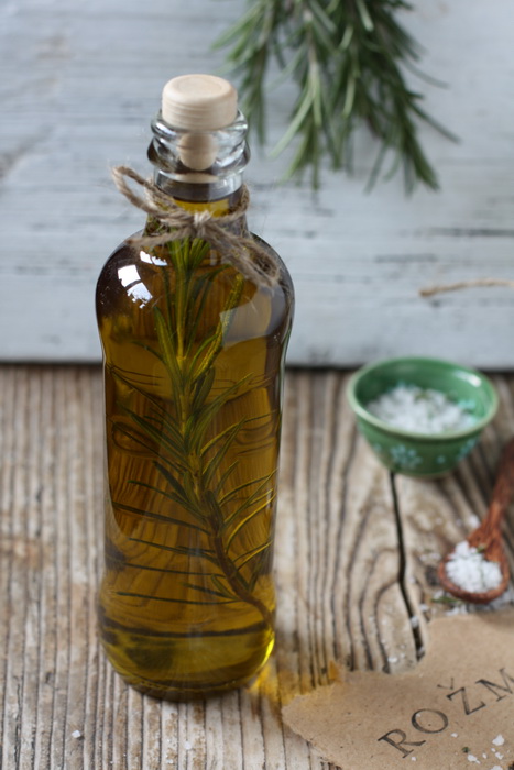 Rožmarin, omamno dišeča mediteranska začimba. Tokrat predstavljamo dve možni uporabi rožmarina – v olivnem olju ter v soli. Krompir začinjen z rožmarinovo soljo je zelo okusen, zeliščno rožmarinovo olje pa je zelo lična ideja za darilo, je fotogenično in privlačno na pogled in ga zato velikokrat podarjamo.. Zeliščno olje je primerno za pripravo omak, marinad, za pripravo sendvičev, enolončnic ali juh.